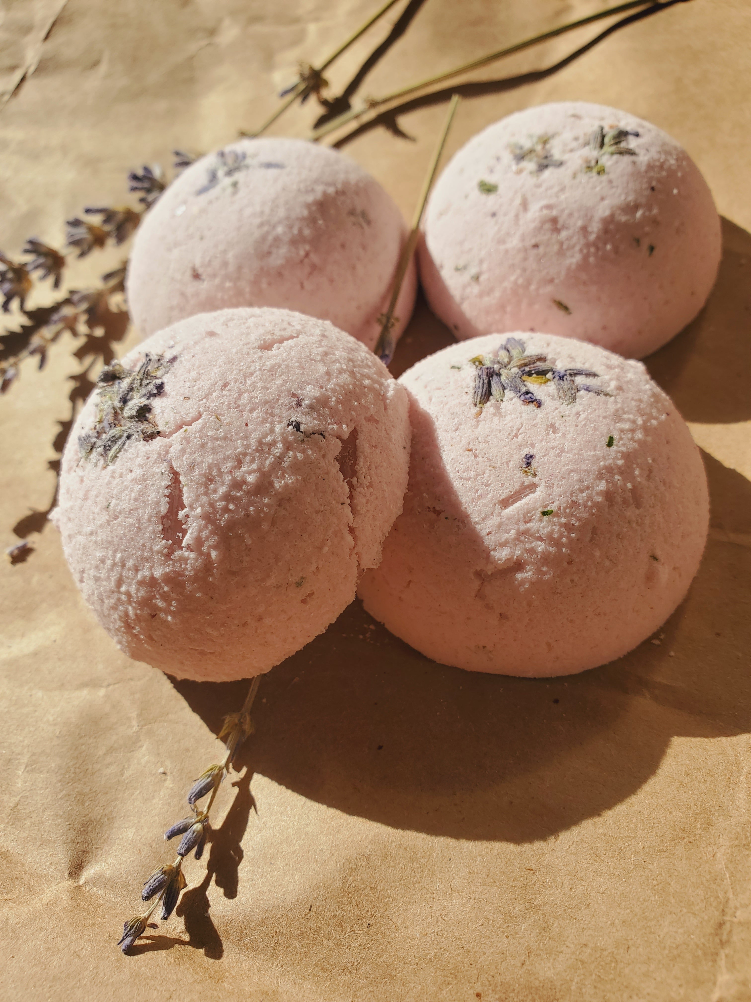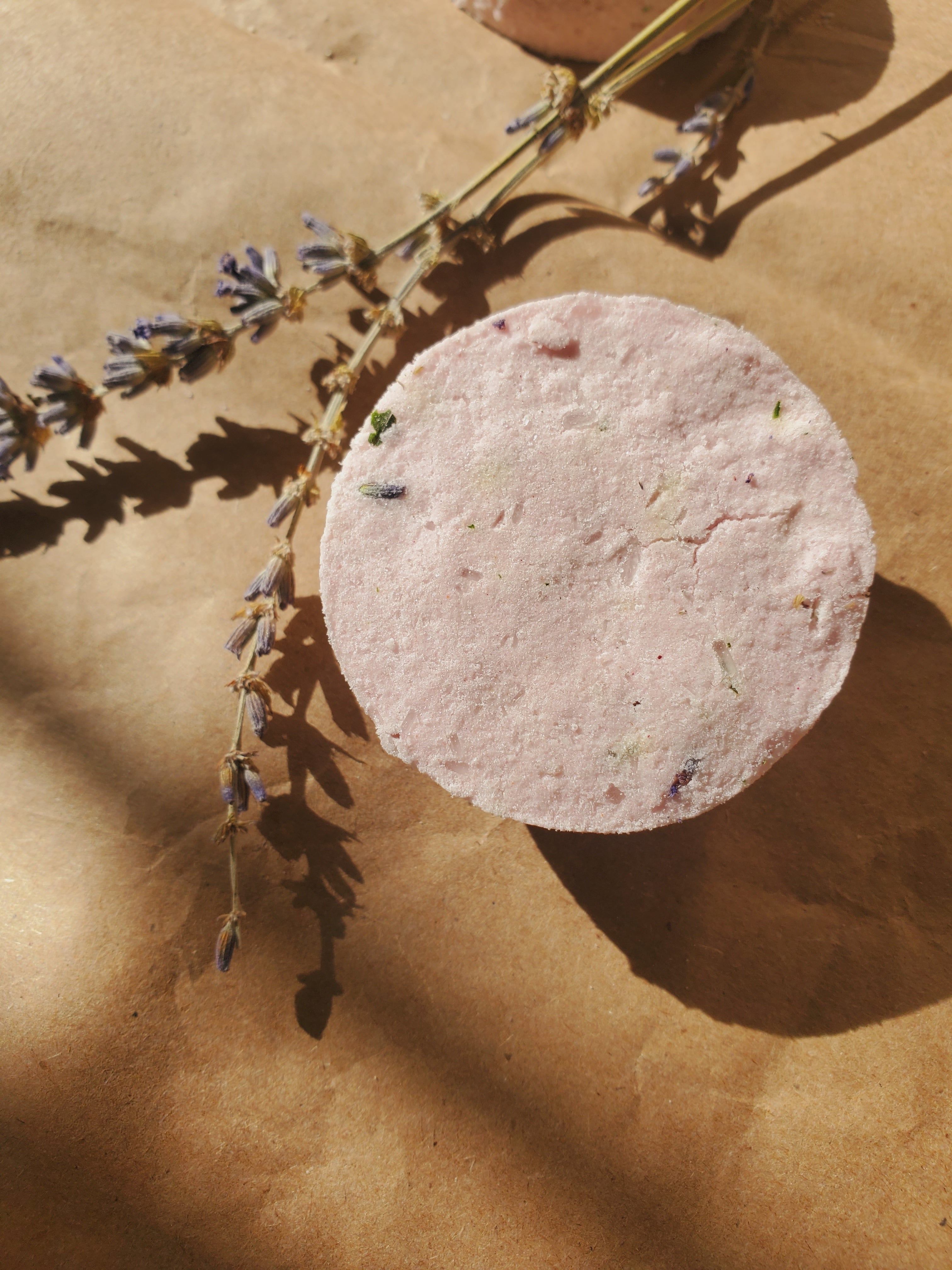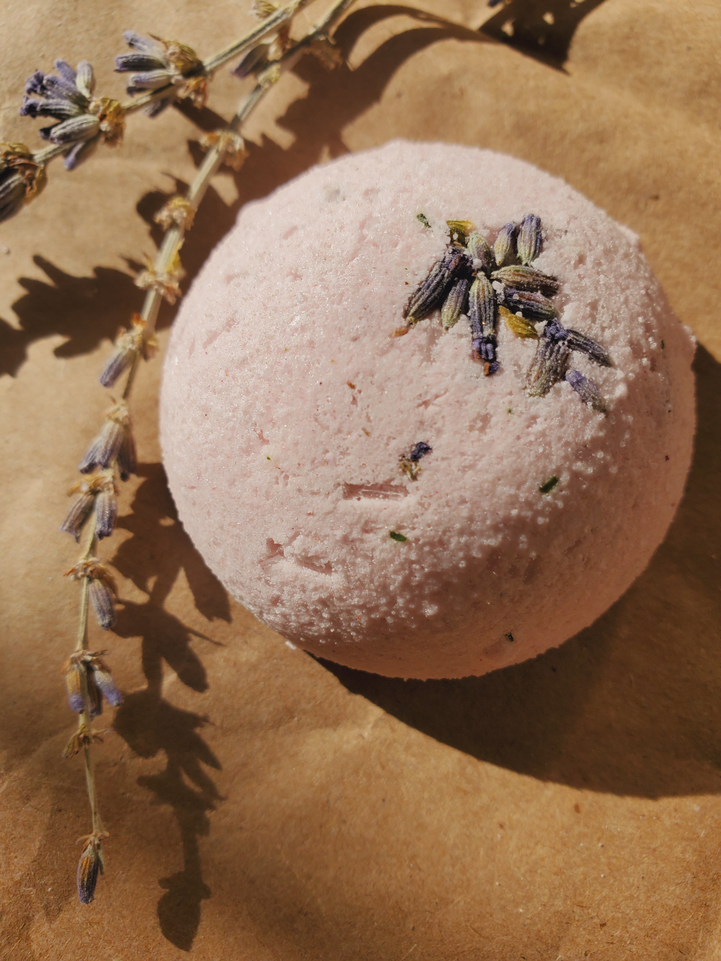 Ingredients: Baking soda, citric acid, corn starch, menthol crystals, castor oil, eucalyptus oil, peppermint oil, rose powder, dried lavender buds, dried rosemary.