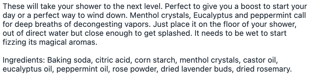 These will take your shower to the next level. Perfect to give you a boost to start your day or a perfect way to wind down. Menthol crystals, Eucalyptus and peppermint call for deep breaths of decongesting vapors. Just place it on the floor of your shower, out of direct water but close enough to get splashed. It needs to be wet to start fizzing its magical aromas.