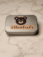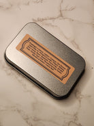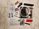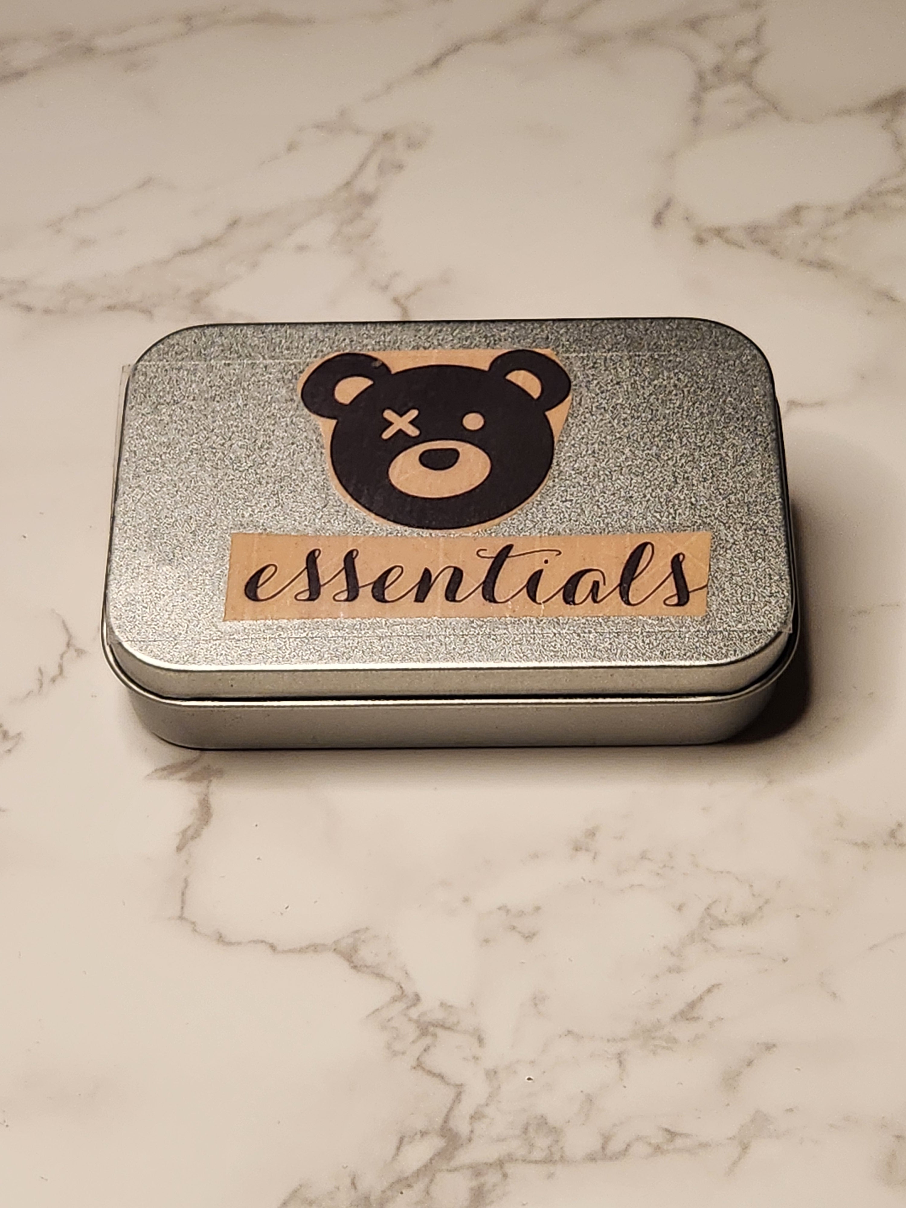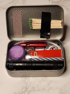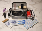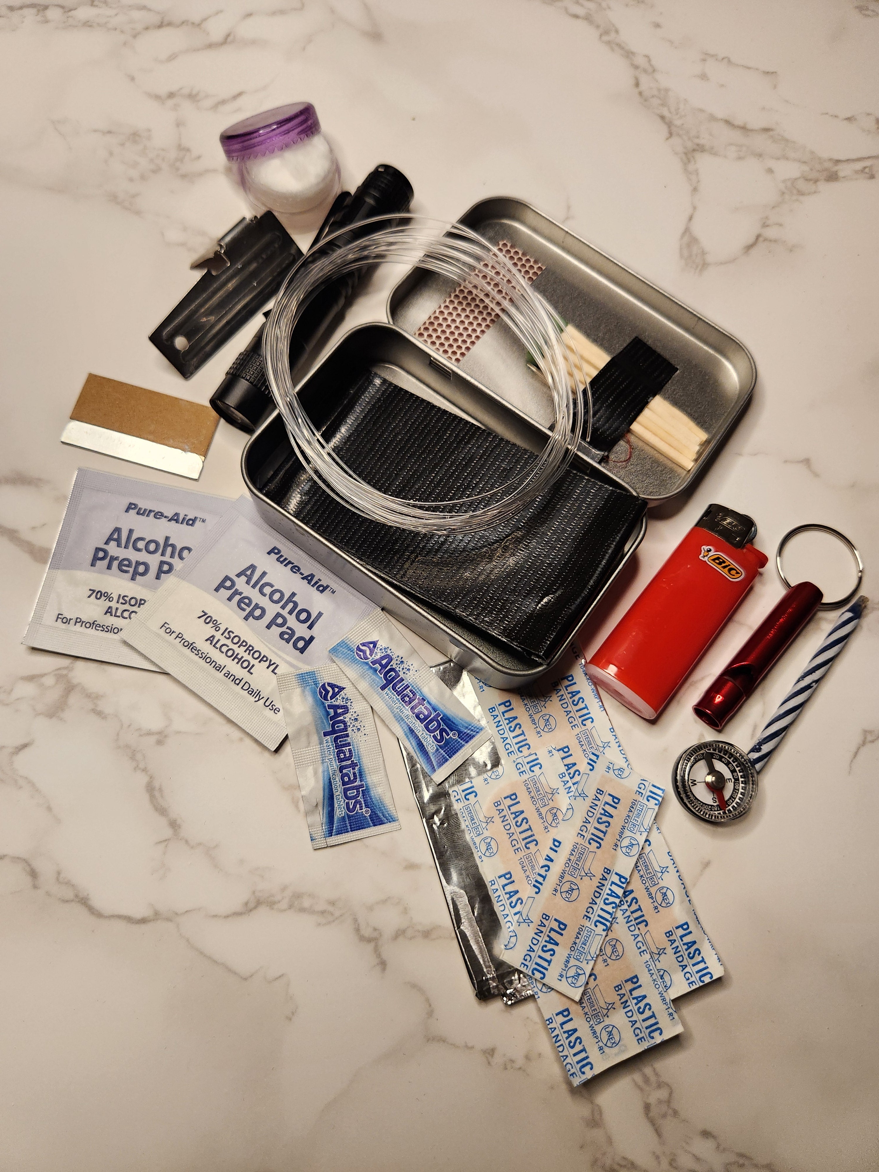 Flashlight with battery. Mini Bic lighter. Button Compass. Can Opener. Aqua Tabs (4 - enough for 2 gallons). Windproof candle. Emergency Whistle. Fishing line & Fishing hook. Razor Blade. Petrol Jelly with cotton ball fire starter. Alcohol prep pads (also flammable). Band aids. Threaded sewing needle. Gorilla Tape. Aluminum Foil. Matches & Striker. Rubber bands. Metal Tin 3.75"×2.5".