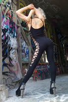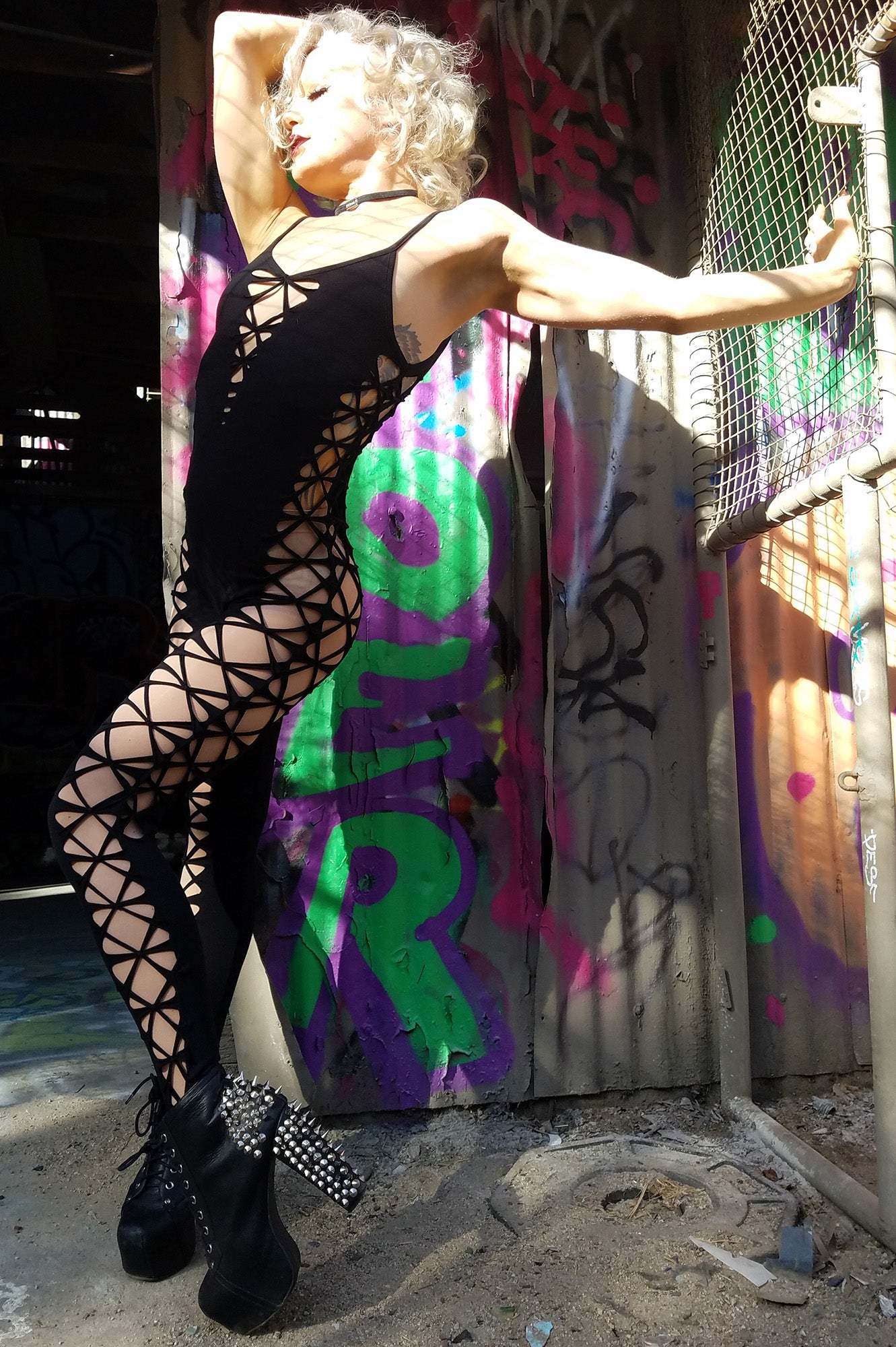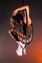 This piece is some serious labor but the end result is pure MAGIC! The open side design goes all the way up in a flattering gradient, making the waist look smaller and the booty look thicker (exactly what dreams are made of) and the Geo Chaos design is just so hypnotic! The perfect outfit for a night on the town and can double as a sick aerial/contortion performance piece. Material: Stretchy Cotton Blend. Warning: people will stare! Models are all wearing size small.