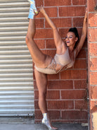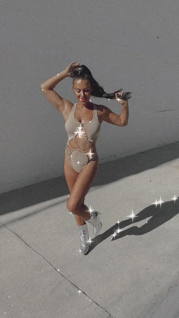 Gorgeous dark sand bodysuit with hand applied rhinestones all over for the ultimate sparkle. Cotton spandex blend. Each bodysuit rhinestone placement will vary slightly since they are applied by hand.
