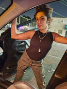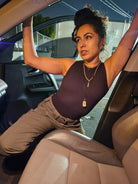 Bodysuit DTY double layered in the front with built in bra with cups. Sleeveless high neck super stretchy and comfy one piece Bodysuit top. Multi purpose slow fashion.