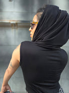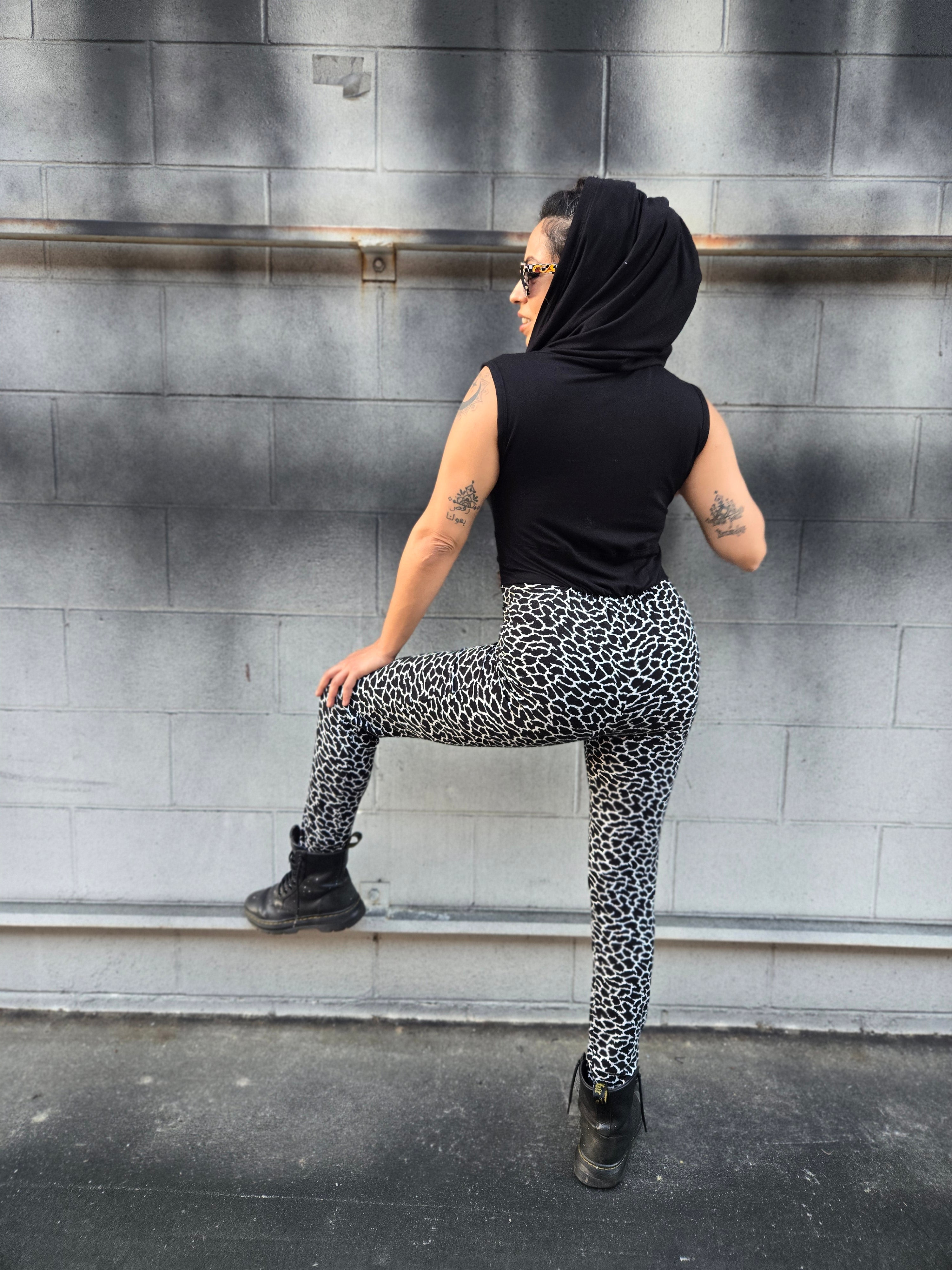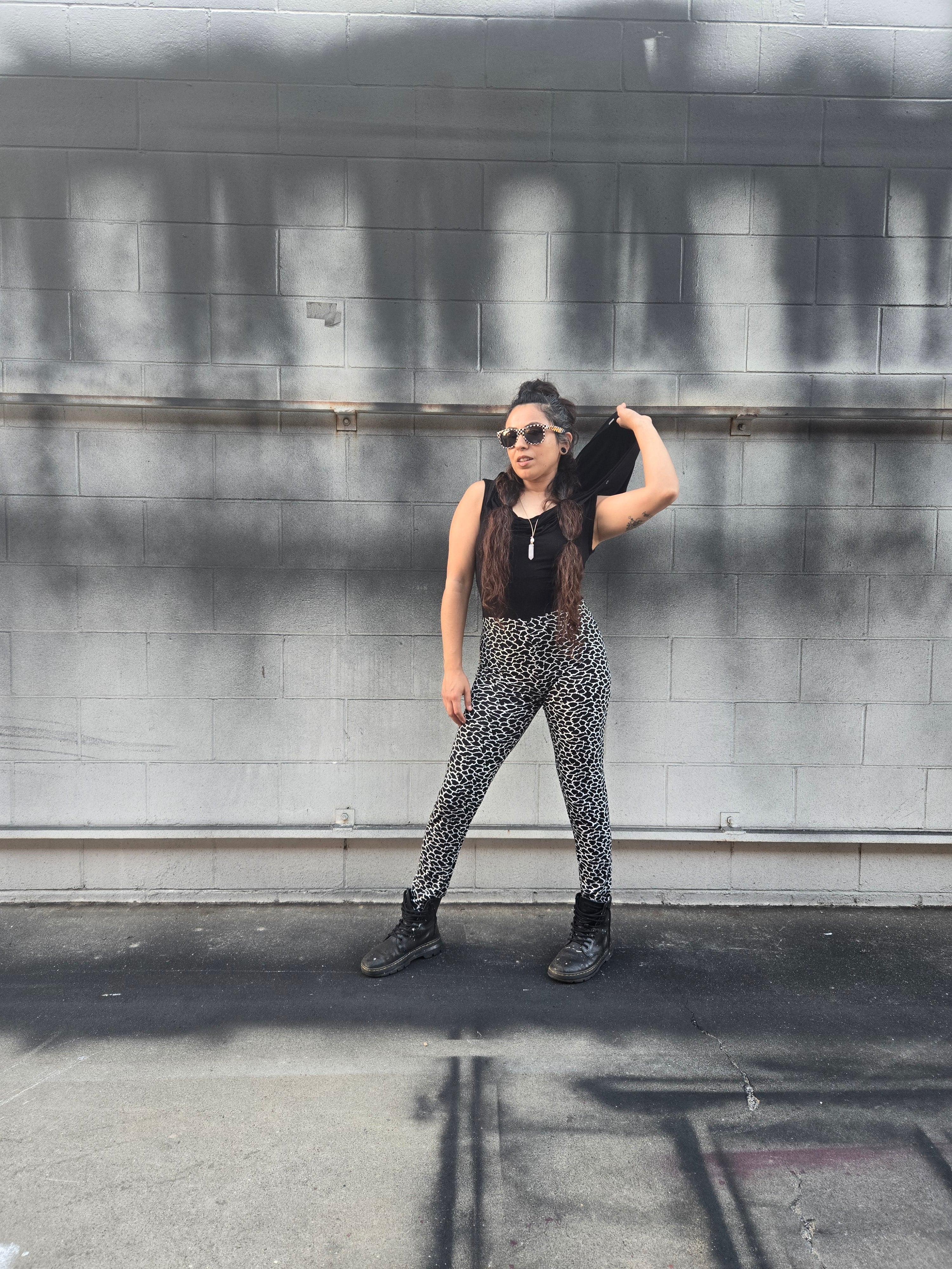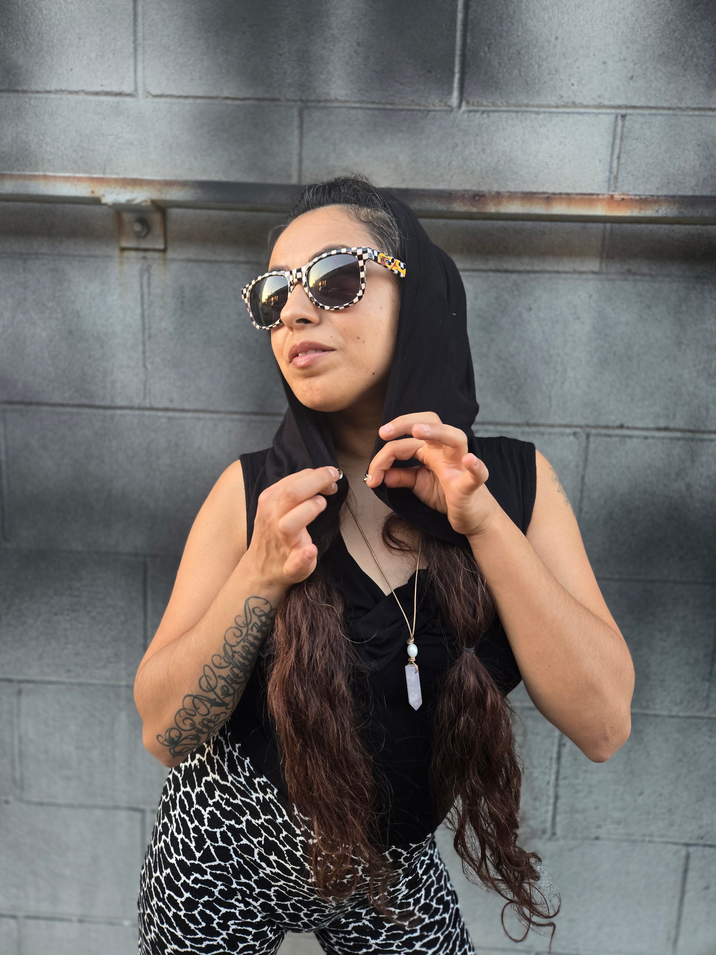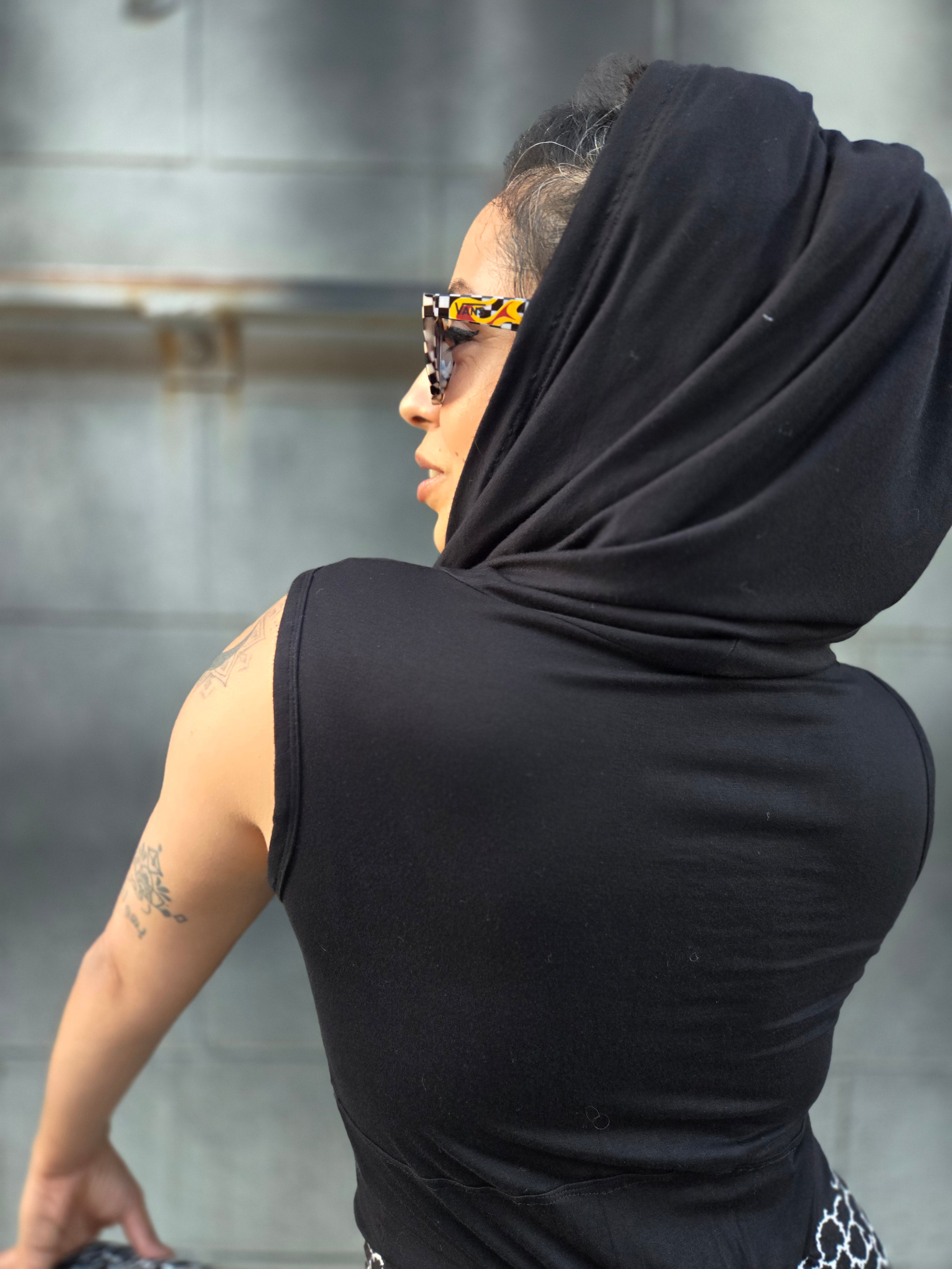 Cotton onesie with hood and cowl neck. Has a button to secure hood for handstands/inversions/wind etc. Size is S/M. High stretch. Model is 5'1" about 120 lbs but there is space for more. No pockets. Elastic sinch in the low back.