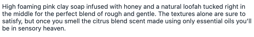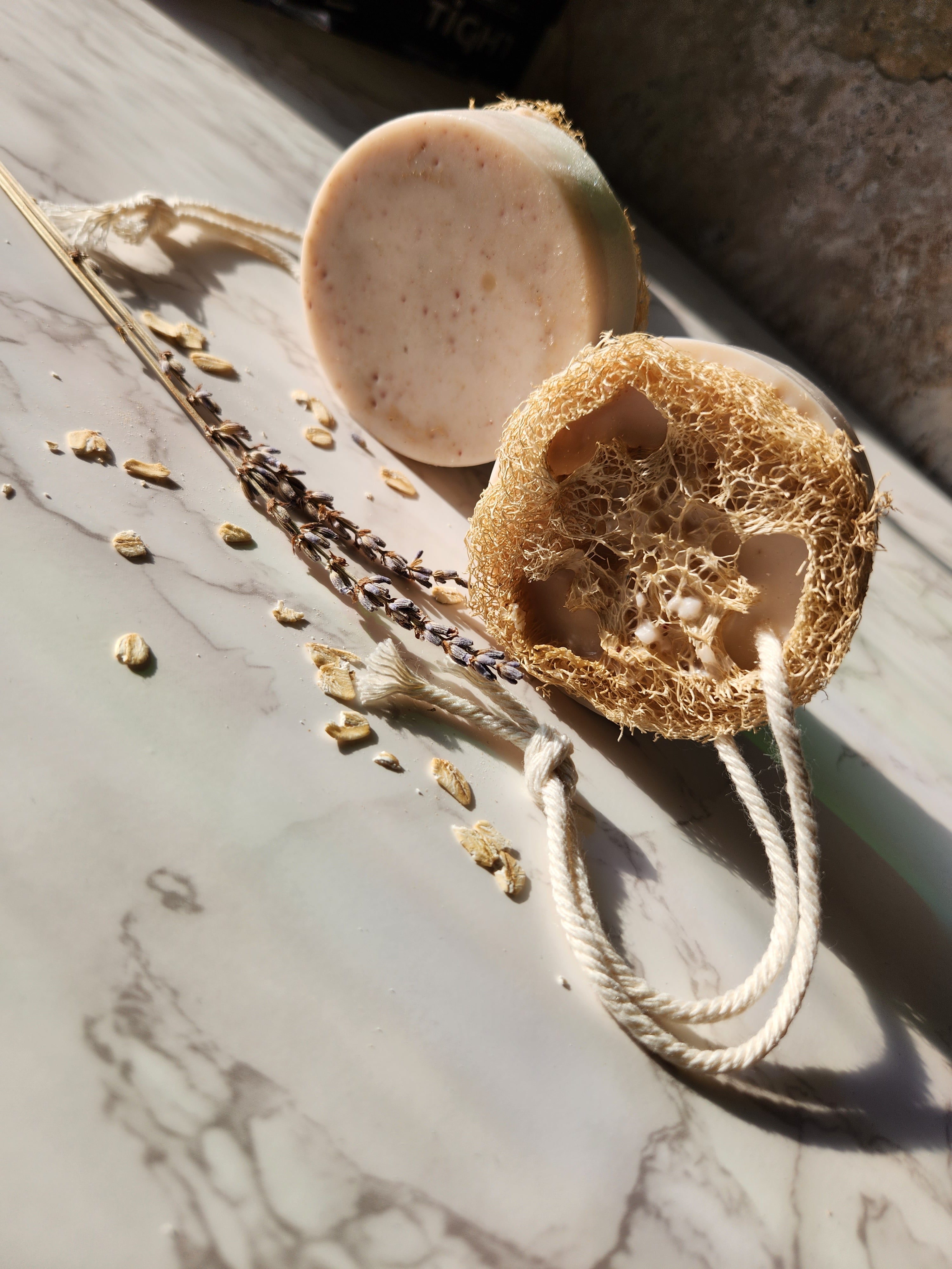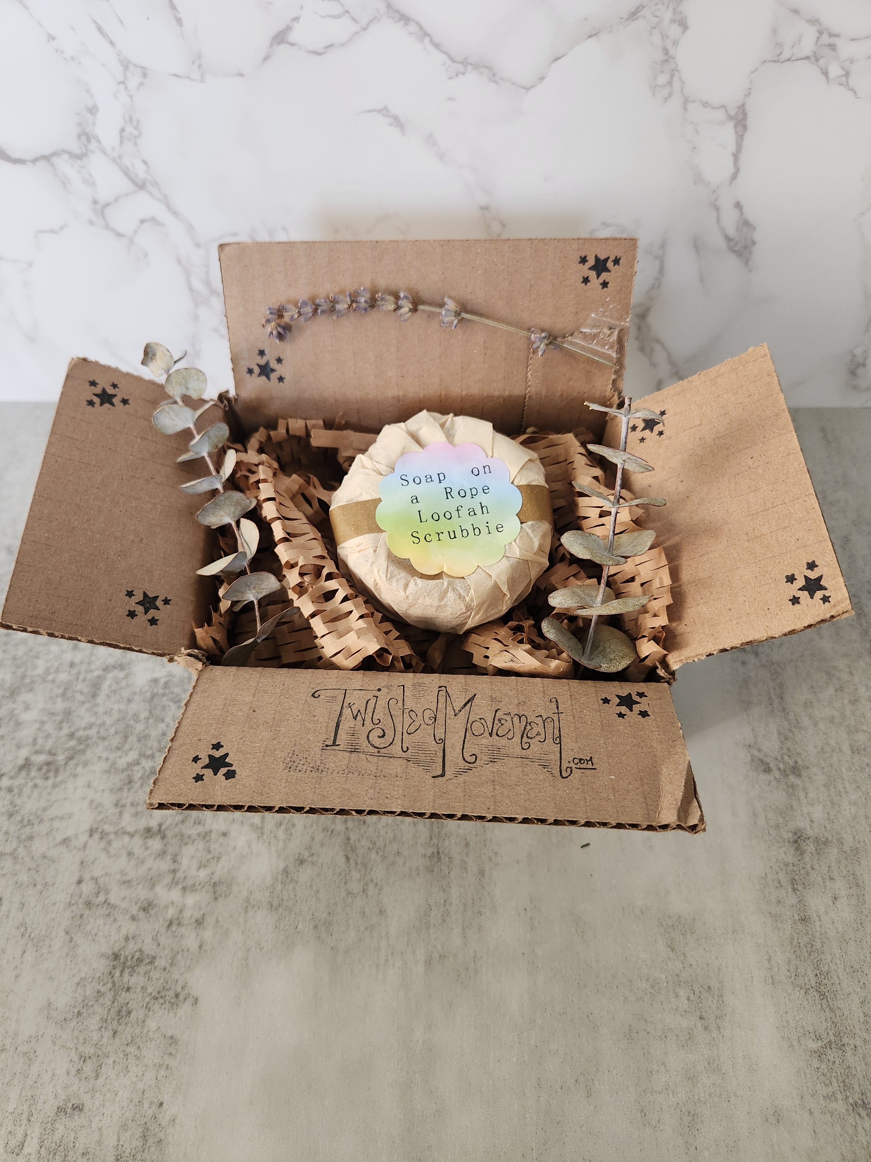 Raspberry Oatmeal Soap covers this natural Loofah on a rope. Giving you all the convenience of cleanings while gently exfoliating. Hang her up between uses to keep her dry and she can stay with you even after the soap is gone. You'll fall in love with her scent and she won't dry out your skin.