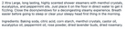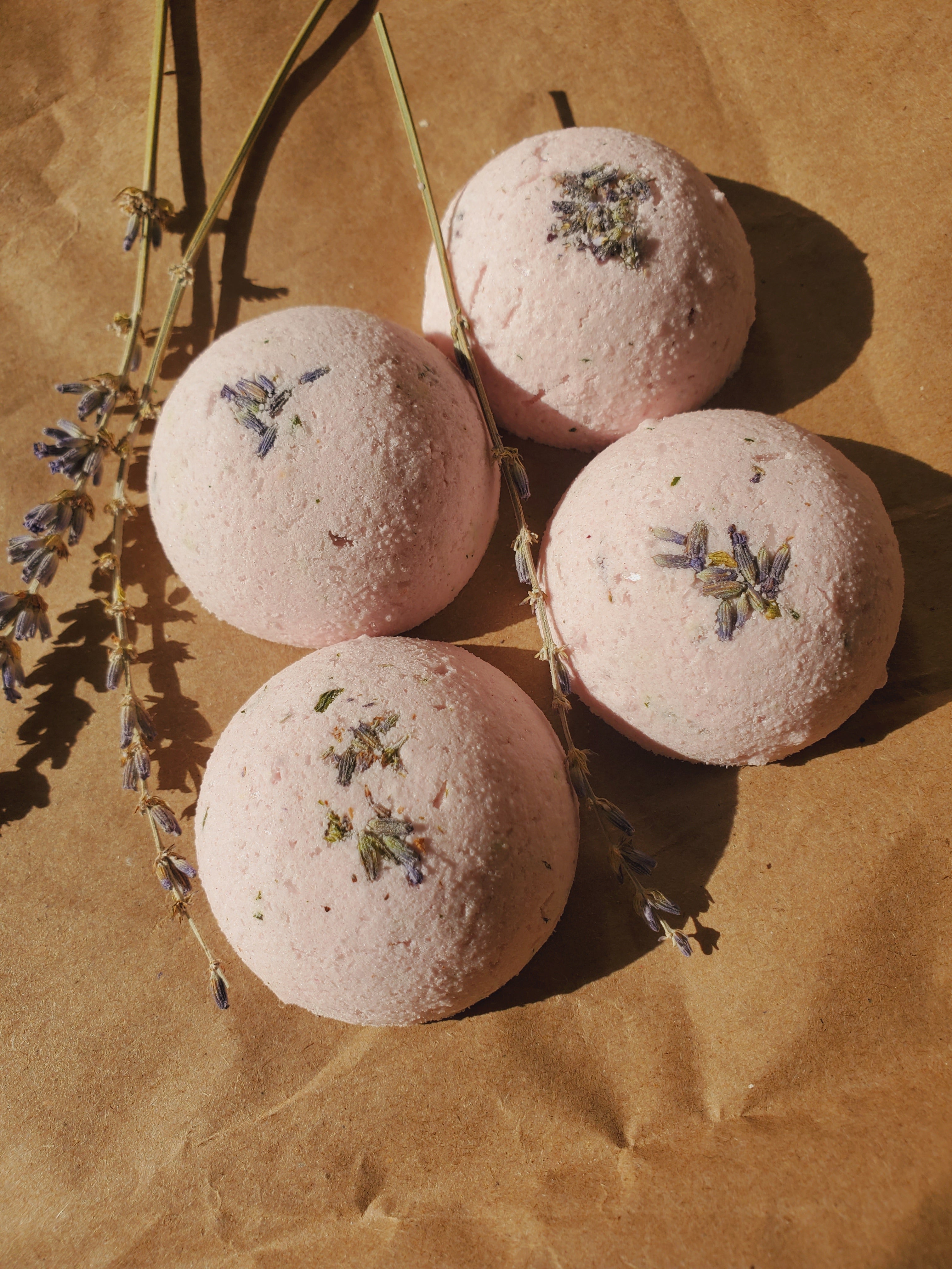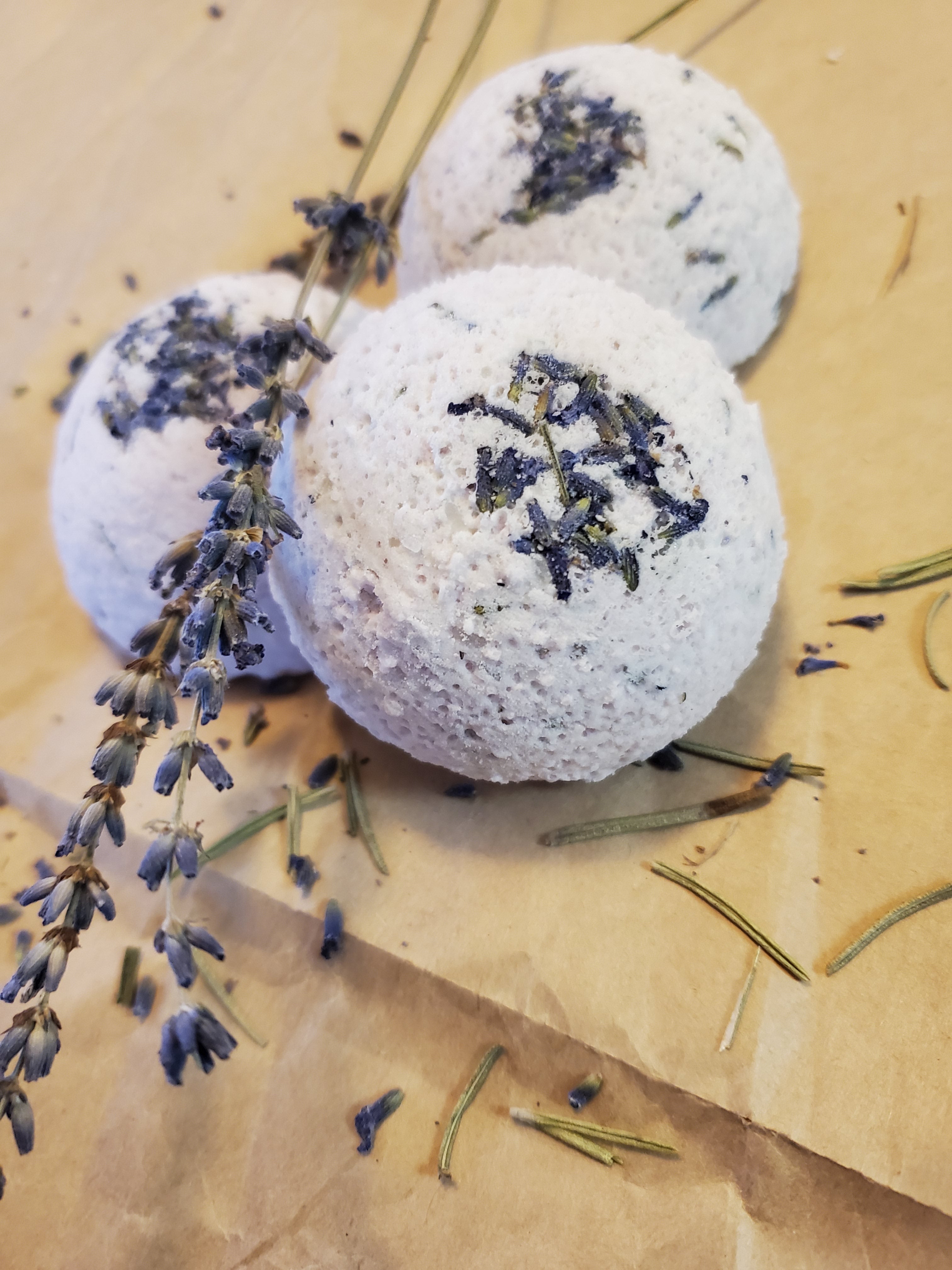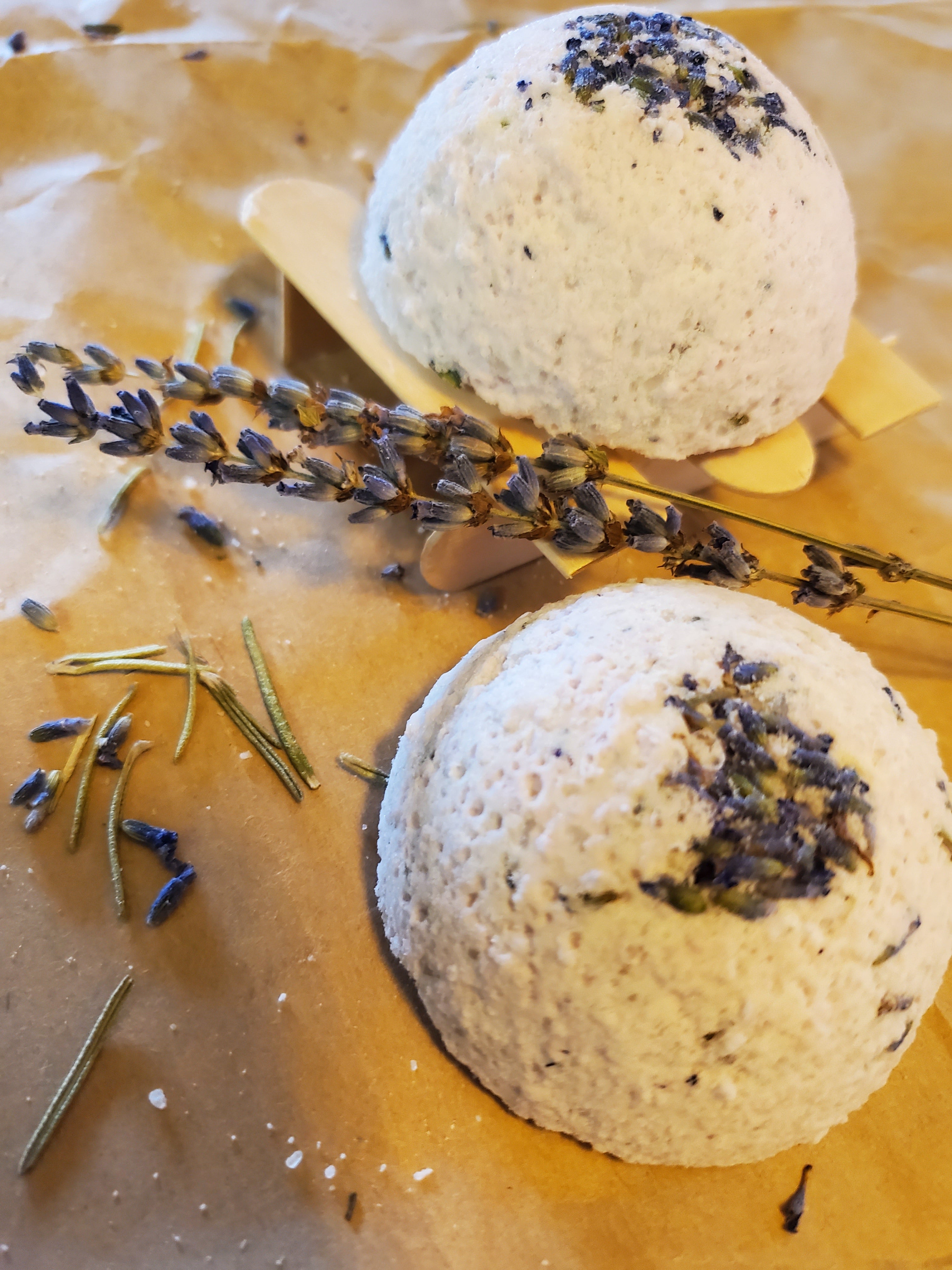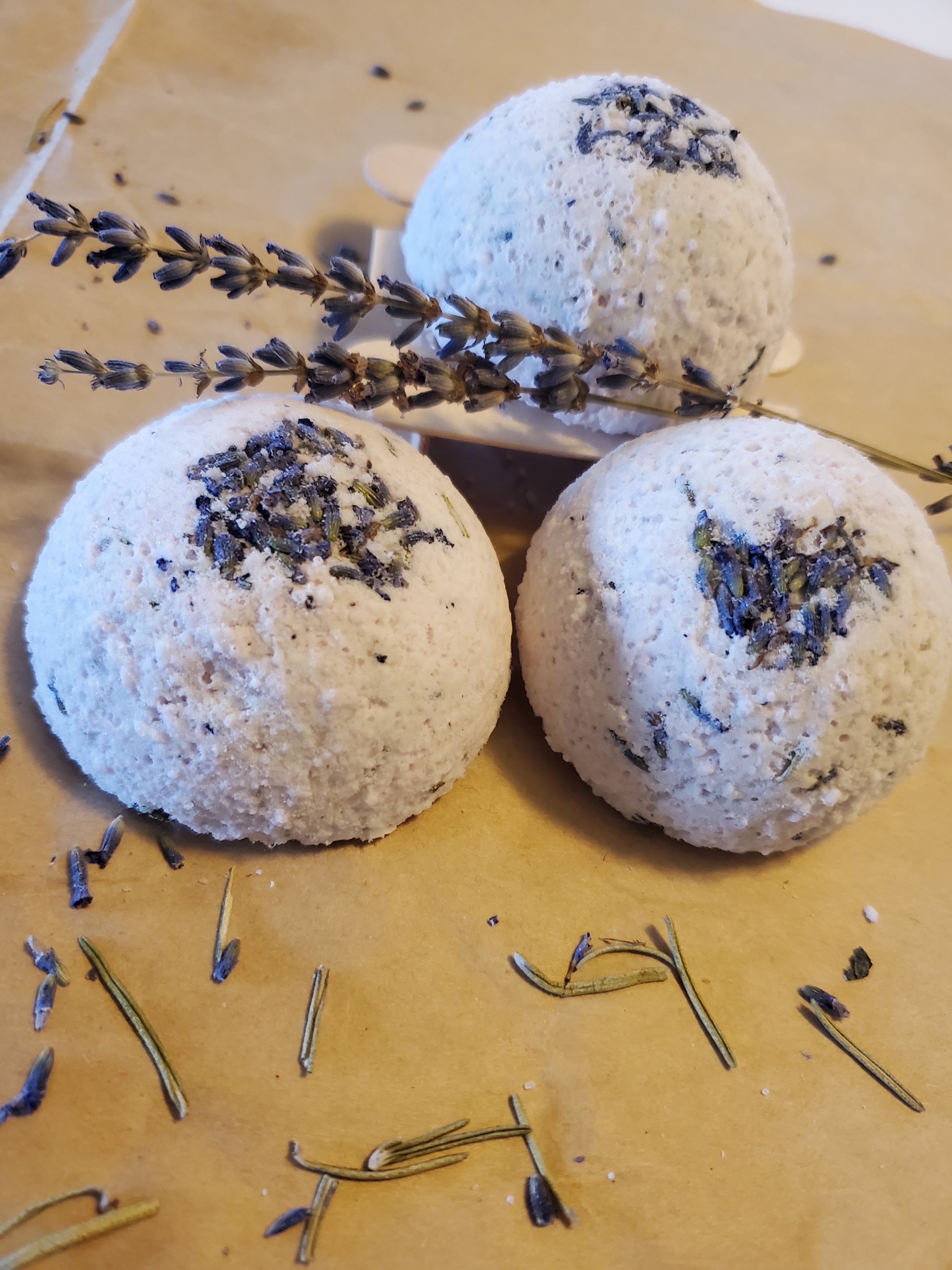 Ingredients: Baking soda, citric acid, corn starch, menthol crystals, castor oil, eucalyptus oil, peppermint oil, rose powder, dried lavender buds, dried rosemary.