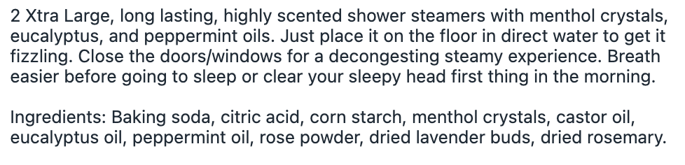 Choose from 2 Xtra Large or 4 Regular Size Steamers. Long lasting, highly scented shower steamers with menthol crystals, eucalyptus, and peppermint oils. Just place it on the floor in direct water to get it fizzling. Close the doors/windows for a decongesting steamy experience. Breath easier before going to sleep or clear your sleepy head first thing in the morning.