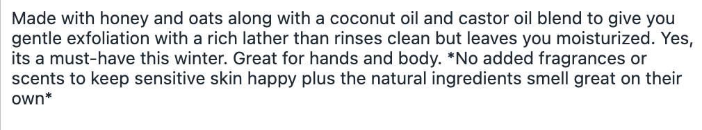 Made with honey and oats along with a coconut oil and castor oil blend to give you gentle exfoliation with a rich lather than rinses clean but leaves you moisturized. Yes, its a must-have this winter. Great for hands and body. *No added fragrances or scents to keep sensitive skin happy plus the natural ingredients smell great on their own*