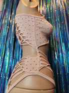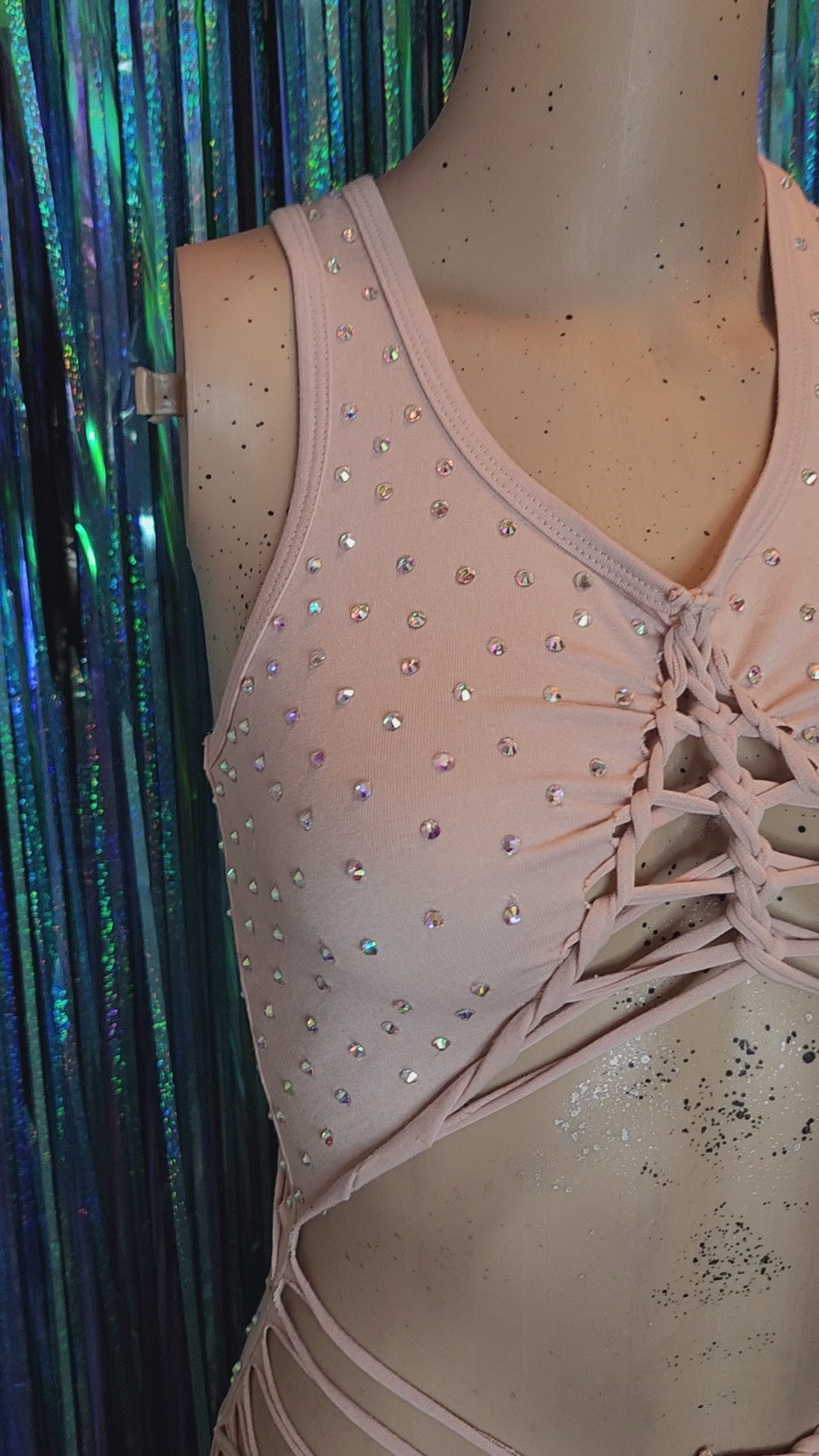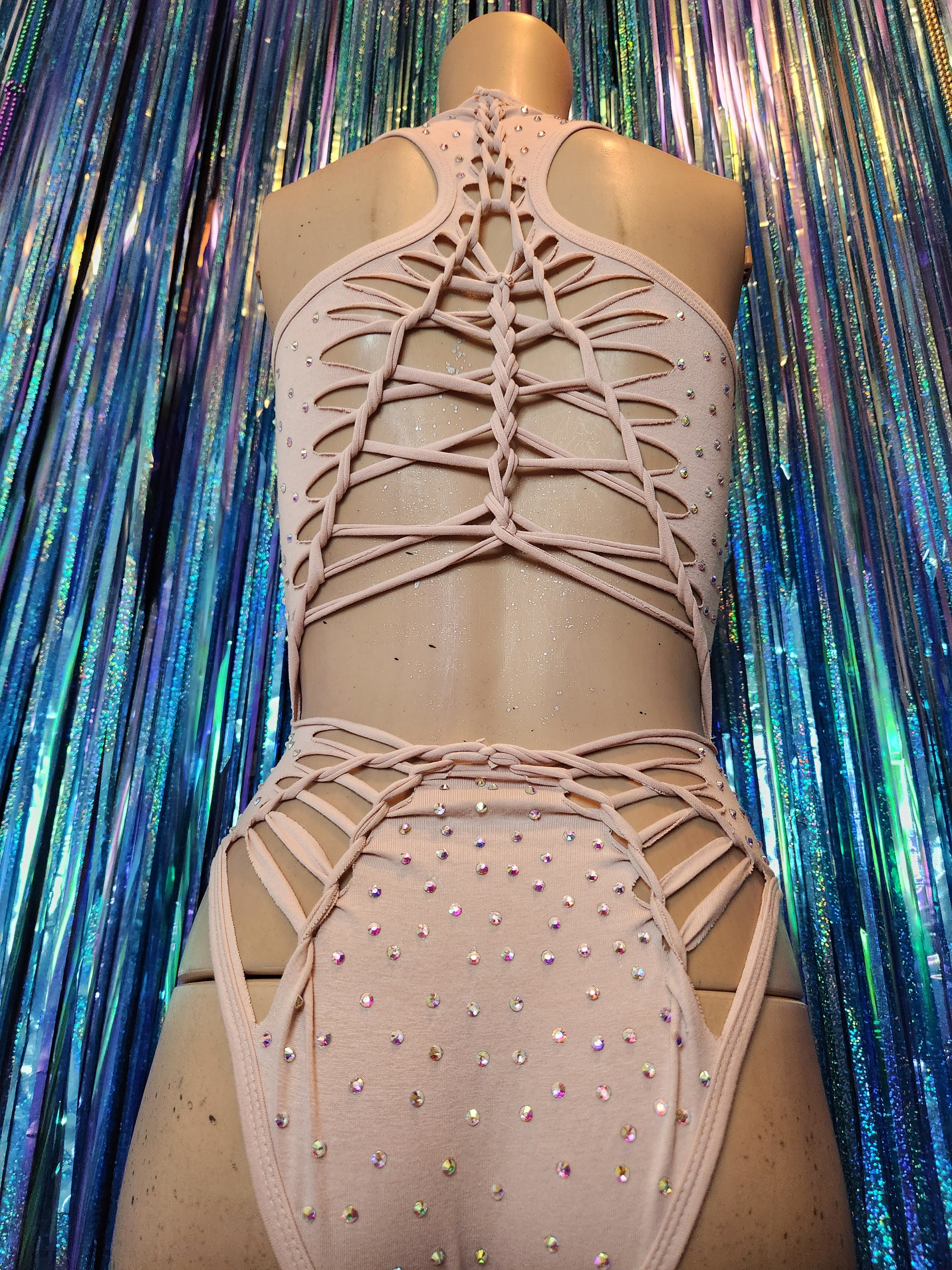 Cotton spandex racer back bodysuit hand cut for an open torso design covered in hundreds of rhinestones done by hand! These are iridescent super sparkly and catch the light every time! Sewn crotch for performers insurance ;) note: can easily use bathroom without having to take off bodysuit.