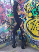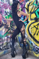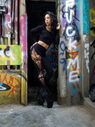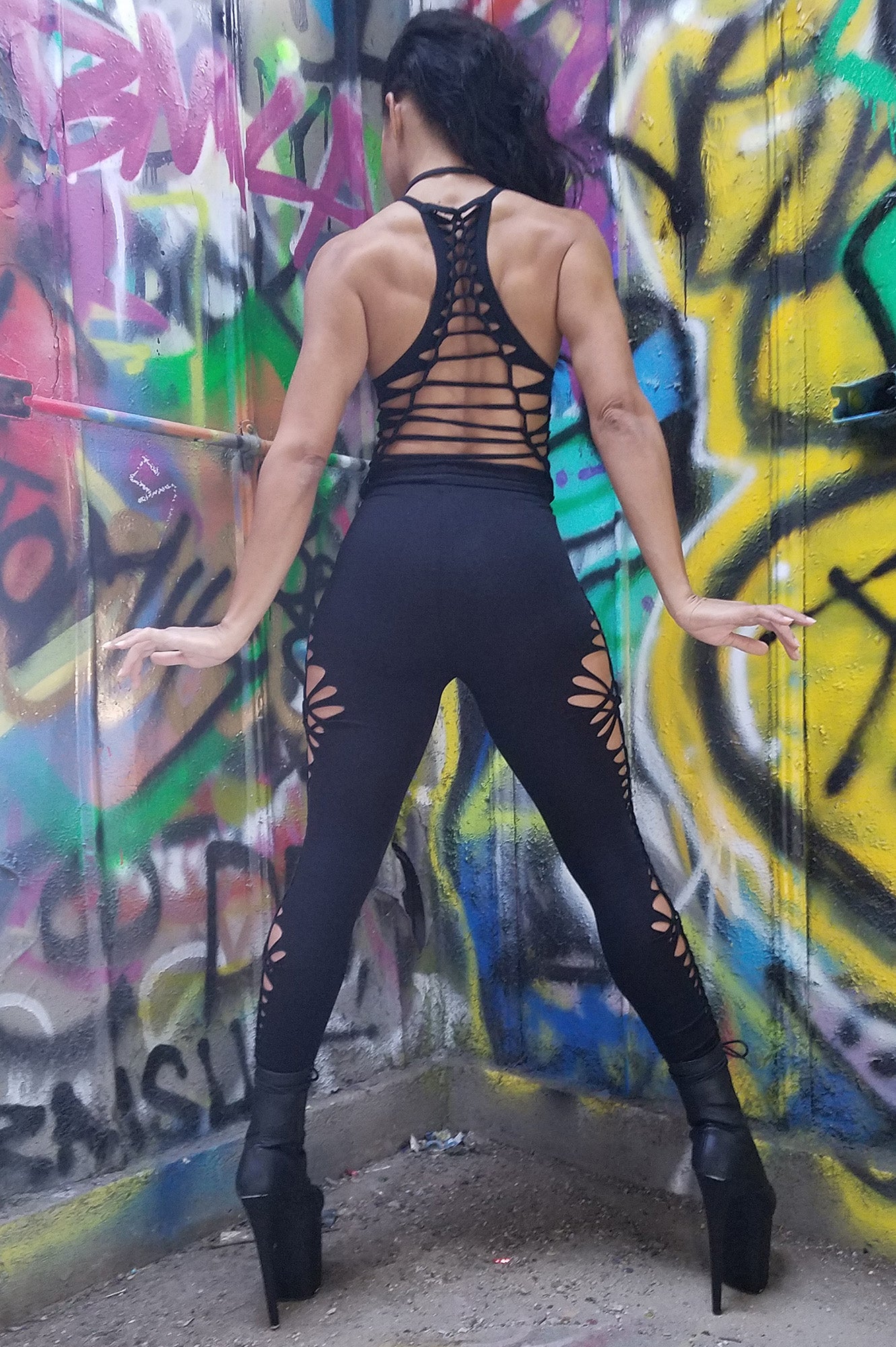 Scope these intricate hand sliced and hand woven leggings! Cut super wide only where it counts for the perfect blend of tease and class. Such an easy and versatile piece! Great for party time, yoga time, errand time, day time or night time... pretty much errytime! Material: Super stretchy and soft microfiber. Models: @foodiewithabanginbooty, @mollymeru, and @veronikapole. Photo of Molly courtesy of Ellen Beard Photography.